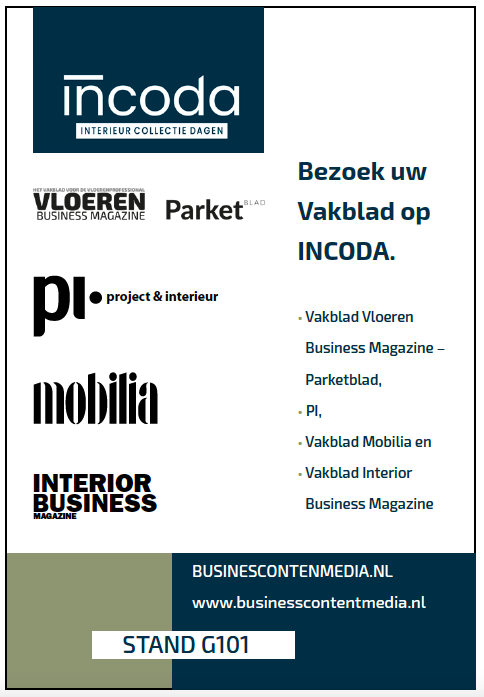 Uitgeverij Business Content Media is met een aantal van haar merken (Vakblad Interior Business Magazine, Vakblad PI., Vloeren Business Magazine-Parketblad en Vakblad Mobilia) present op de interieur vakbeurs Incoda, die zondag van start gaat en wordt gehouden van 21 t/m 23 september. Business Content Media is met marktleidende vaktitels mediapartner van het evenement en publiceerde recentelijk dikke beursedities van Vloeren Business Magazine-Parketblad en Vakblad Mobilia. Kom kennis maken met het team op stand G101 of loop one mensen tegen het lijf op de beursvloer waar onze redactie druk aan het werk is. Bij de ingang van de vakbeurs worden de magazines tevens uitgedeeld door mensen van de beursorganisatie. De vakbladen zijn voorzien van deelnemerslijst en plattegrond.