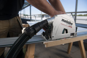 “Niet alleen aan de absolute precisie, maar ook aan de netheid hebben wij bij de ontwikkeling van de zaag extra aandacht besteed“, zegt Grün. „Juist bij werkzaamheden binnenshuis of bij het zagen van gips- of cementgebonden platen met bijzonder fijn stof zijn rondvliegende materiaalresten hinderlijk.“ De meegeleverde stofzak neemt het grootste deel van de spaanders op. Voor optimale netheid kan een stofzuiger worden aangesloten, bijvoorbeeld de nieuwe Metabo accu-alleszuiger ASR 36-18 BL 25 M SC. Dankzij het CordlessControl-systeem start deze automatische, zodra de zaag in gebruik wordt genomen – apart met de hand in- en uitschakelen is niet meer nodig. Kan er zonder afzuiging worden gewerkt, dan kan de adapter voor de zuigslang naar wens gedraaid en vergrendeld worden.