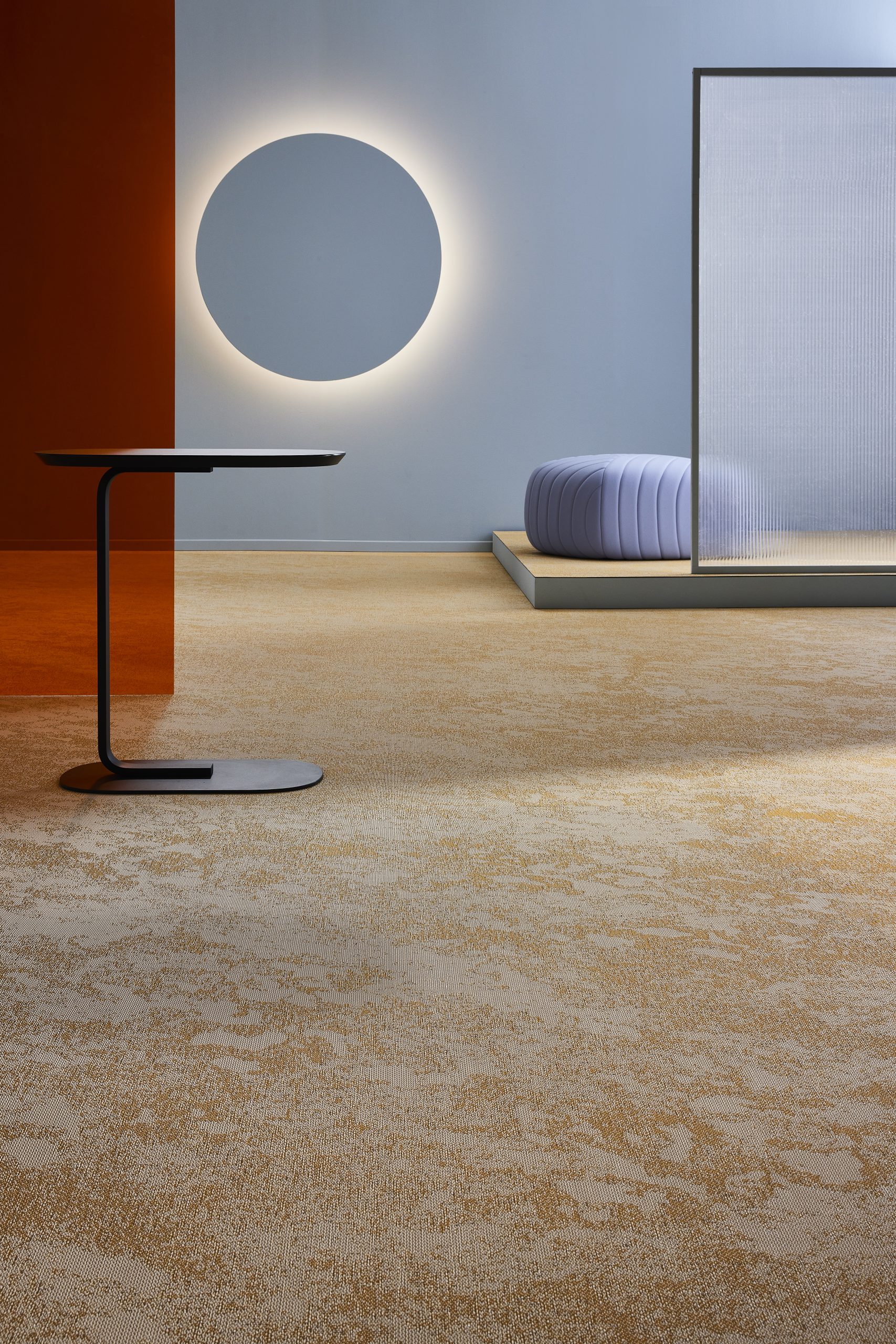 10 meter is er een snijservice op maat) als in tegels van 50×50 cm. “Maar ook uitgesneden in bijzondere vormen die een grote vrijheid van ontwerpen biedt aan architecten en designers; het zogenaamde Shape Lab programma”, zo stelt Daniel Ledoux. Er is een keuze uit 6 collecties in 59 kleuren en de compact geweven vloeren hebben ook een akoestische functie, met een waarde van wel 18dB.