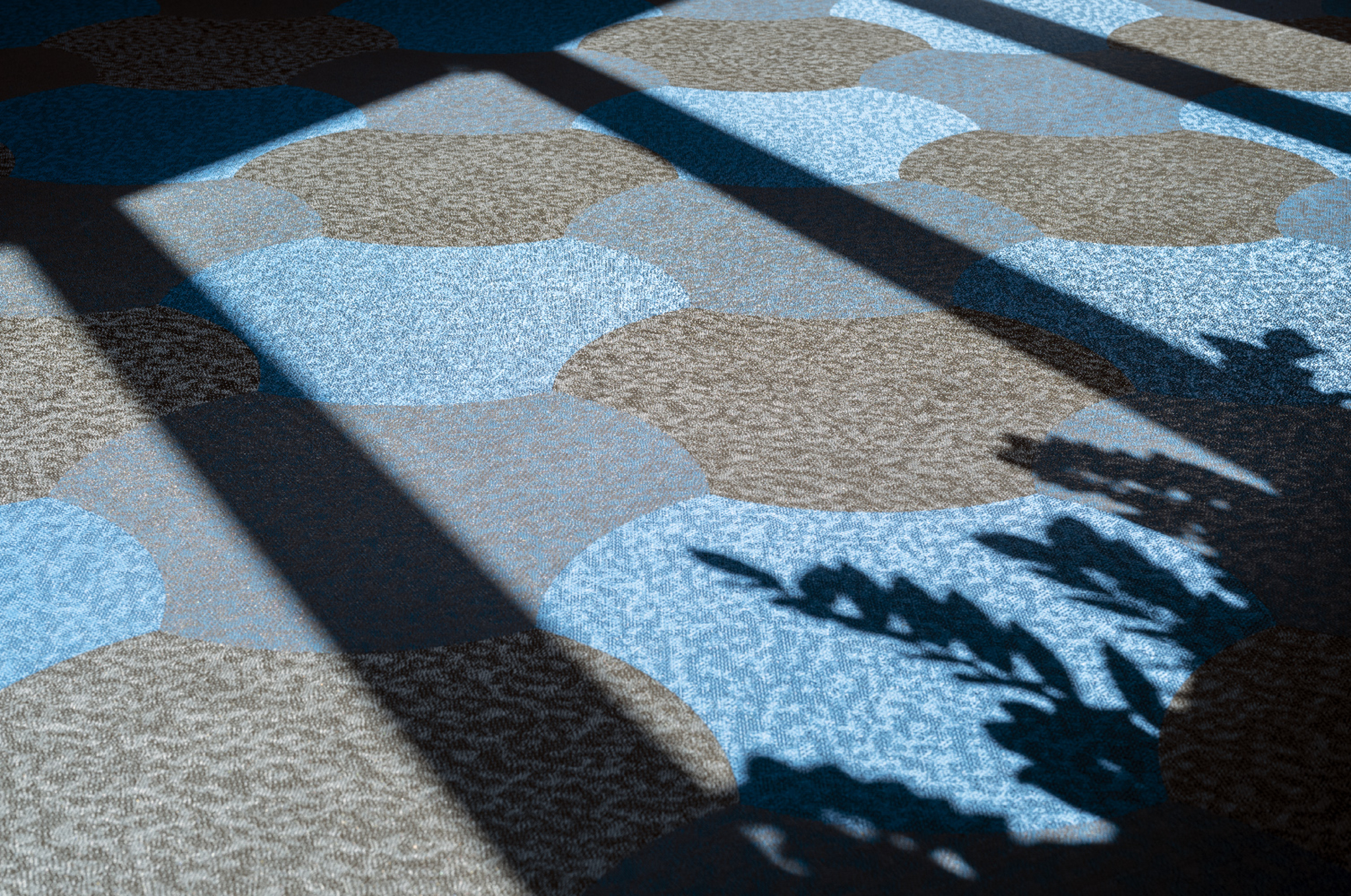 10 meter is er een snijservice op maat) als in tegels van 50×50 cm. “Maar ook uitgesneden in bijzondere vormen die een grote vrijheid van ontwerpen biedt aan architecten en designers; het zogenaamde Shape Lab programma”, zo stelt Daniel Ledoux. Er is een keuze uit 6 collecties in 59 kleuren en de compact geweven vloeren hebben ook een akoestische functie, met een waarde van wel 18dB.
