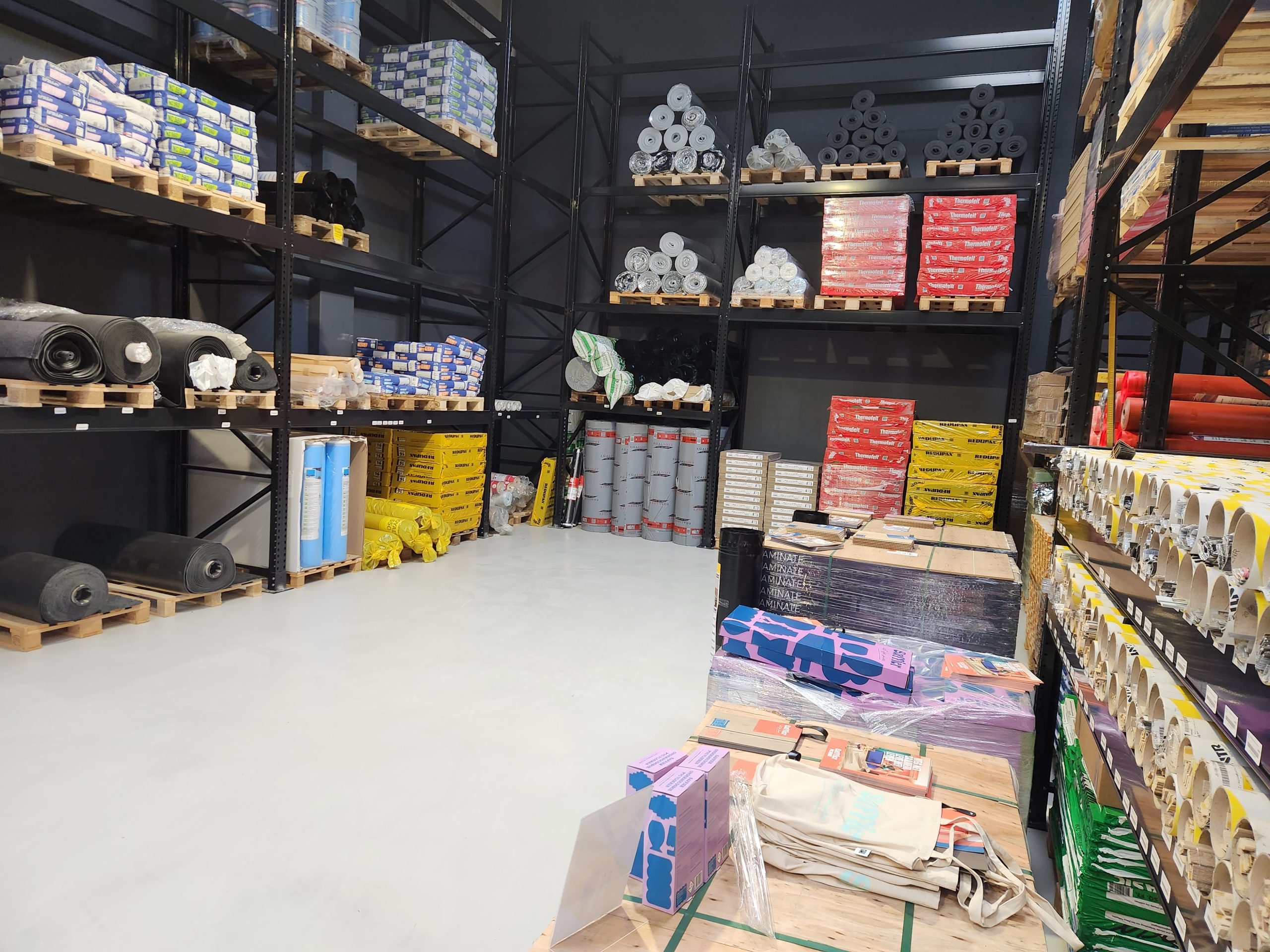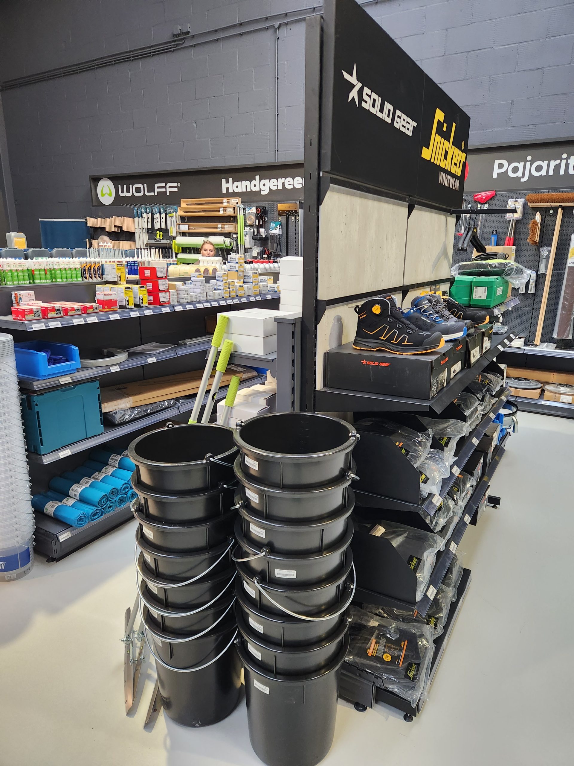 Ongeveer 100 genodigden kwamen in de namiddag en vroege avond langs in het INTR. Point dat gevestigd is in een voormalige boksschool. De inrichting is fraai en helder gehouden, de zwarte stellingen en kasten doen de producten goed uitkomen en trekken ook de aandacht naar de producten van, onder andere, Uzin Utz, Pajarito, Pallmann, Snickers Workware, Wolff en Redupax. Gerben Bouwmeester: “Dat zwarte in het interieur is een overblijfsel van de boksschool. De eerste reactie was: we schilderen alles wit, maar ik zei: nee, we laten het zo en richten de rest ook in met zwart als achtergrondkleur: het trekt de aandacht naar de producten en maakt de ruimte intiemer.”